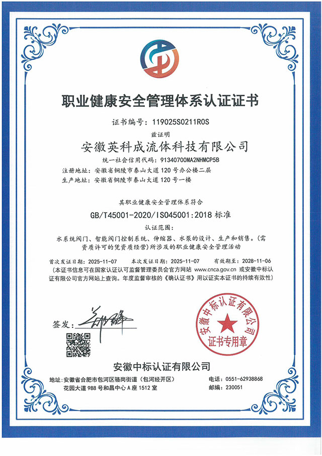 職業健康安全管理體系認證證書